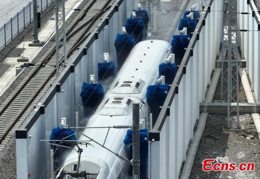 An automatic car washing system operates at the Yongjin high-speed train base in Ningbo, east China's Zhejiang Province, April 9, 2025. (Photo: China News Service/Wang Gang)