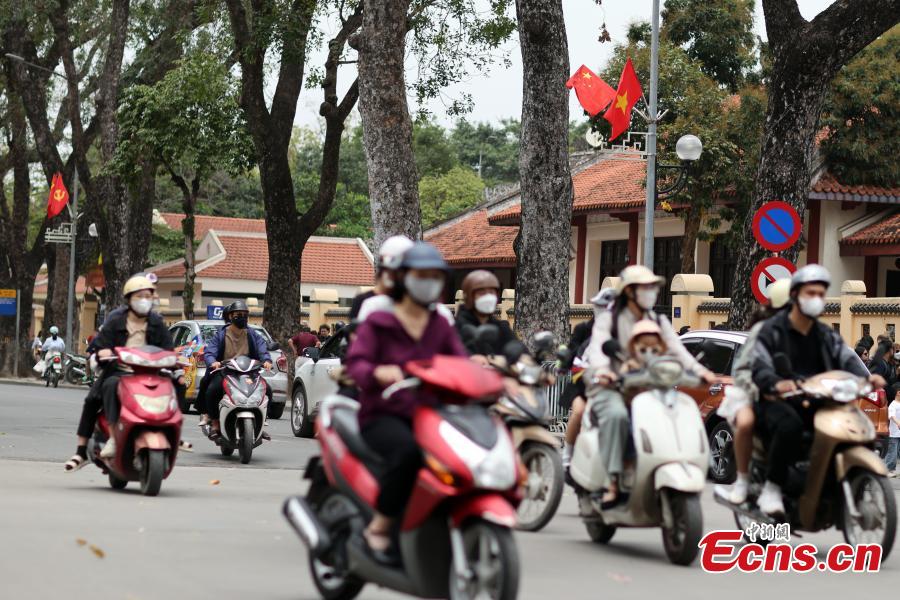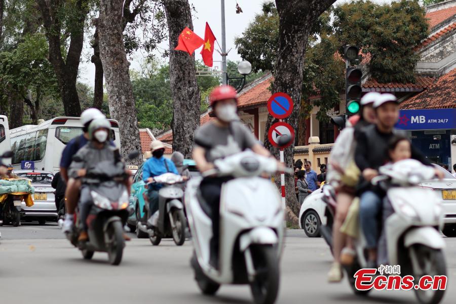 Chinese and Vietnamese national flags are hung along a street in Hanoi, Vietnam, April 13, 2025. (Photo: China News Service/Sheng Jiapeng)