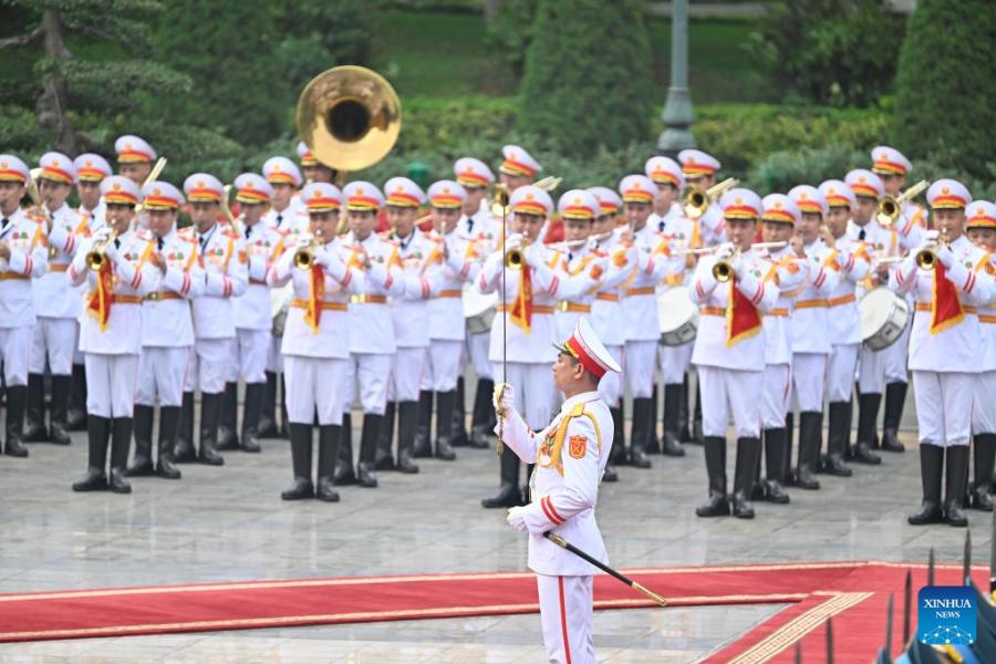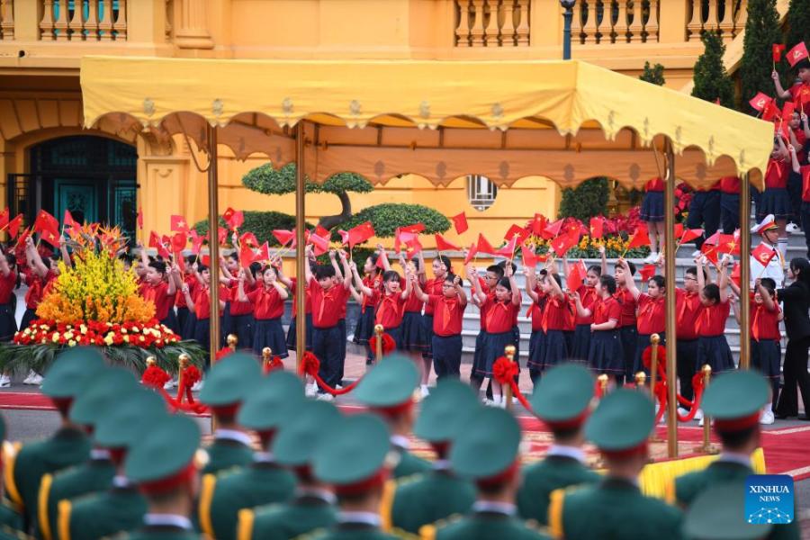 Xi Jinping, general secretary of the Communist Party of China Central Committee and Chinese president, attends a welcome ceremony held by To Lam, general secretary of the Communist Party of Vietnam Central Committee, in Hanoi, Vietnam, April 14, 2025. (Xinhua/Yan Yan)