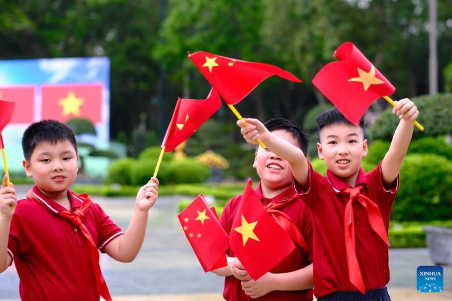 Xi Jinping, general secretary of the Communist Party of China Central Committee and Chinese president, poses for photos with To Lam, general secretary of the Communist Party of Vietnam Central Committee, during a grand welcome ceremony held by Lam in Hanoi, Vietnam, April 14, 2025. Xi arrived in Hanoi on Monday to pay a state visit to Vietnam. (Xinhua/Li Xueren)