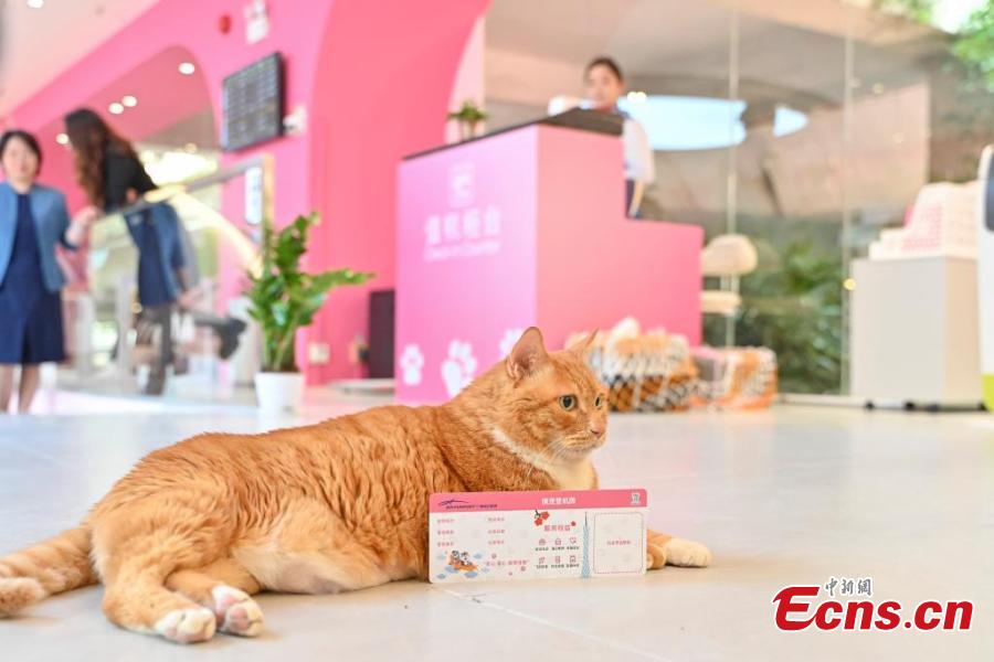 A cat with its boarding pass is captured at the check-in lobby with pet at Baiyun Airport in Guangzhou, south China's Guangdong Province, April 14, 2025. (Photo: China News Service/Chen Jimin)