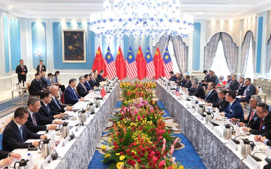 Chinese President Xi Jinping holds talks with Malaysian Prime Minister Anwar Ibrahim at the prime minister's official residence in Putrajaya, Malaysia, April 16, 2025. (Xinhua/Ding Lin)