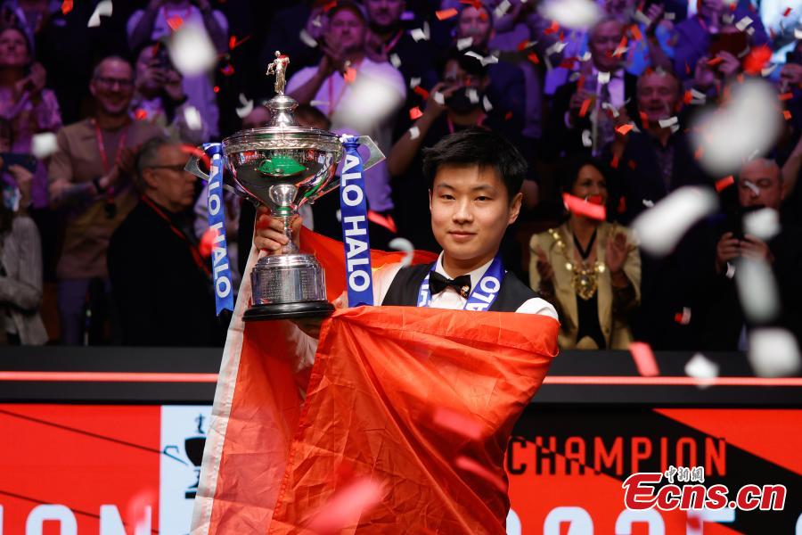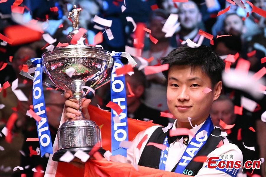 China's Zhao Xintong celebrates with the trophy after winning his final match against Wales' Mark Williams at World Snooker Championship 2025 in Sheffield, Britain, May 5, 2025. (Photo/VCG)