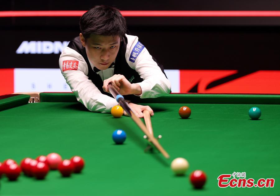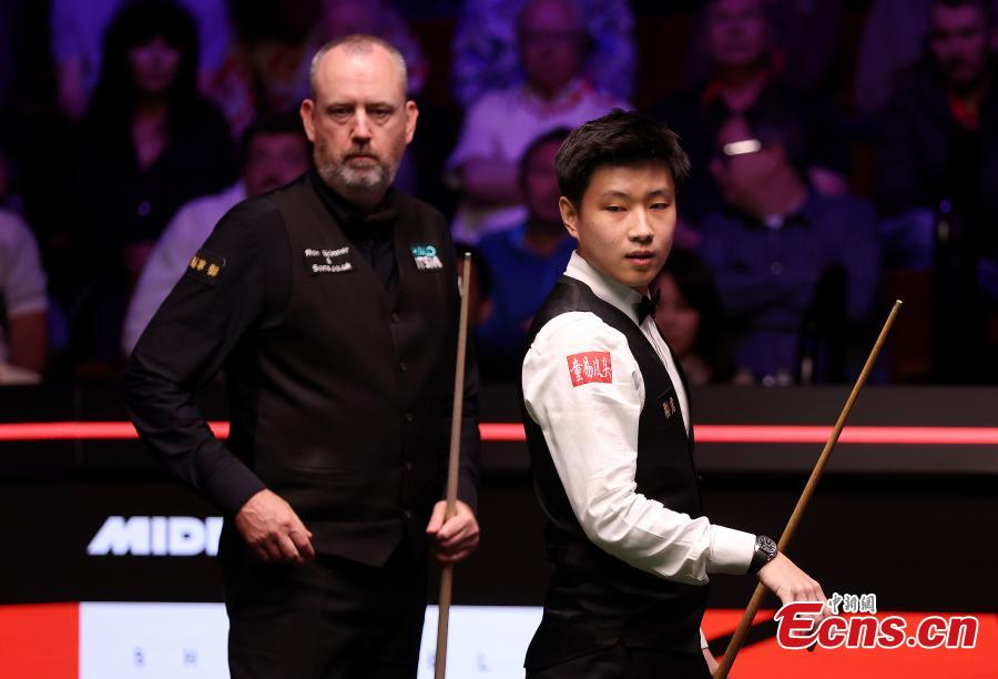 China's Zhao Xintong competes during the final between Zhao Xintong of China and Mark Williams of Wales at World Snooker Championship 2025 in Sheffield, Britain, May 5, 2025. (Photo/VCG)
