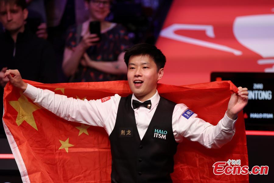 China's Zhao Xintong celebrates victory after winning his final match against Mark Williams of Wales at World Snooker Championship 2025 in Sheffield, Britain, May 5, 2025. (Photo/VCG)