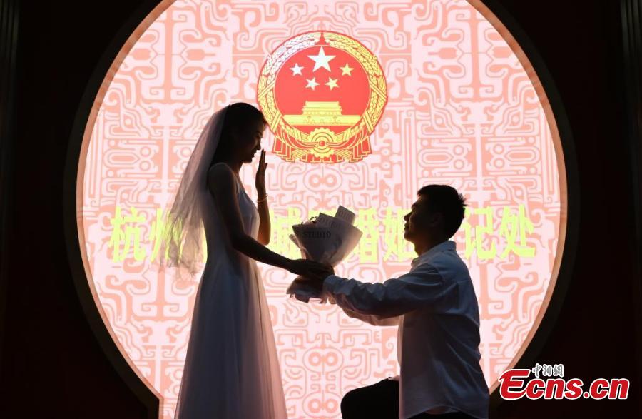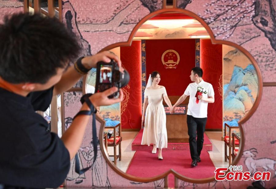 A couple poses for a photo at a marriage registry in Hangzhou, east China's Zhejiang Province, May 20, 2025. (Photo: China News Service/Wang Gang)