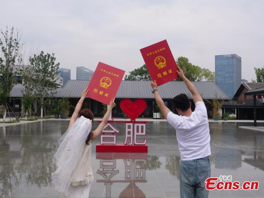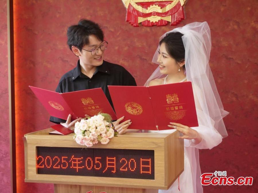 A couple poses for a photo at a marriage registry in Hefei, central China's Anhui Province, May 20, 2025. (Photo: China News Service/Zhang Lingxuan)