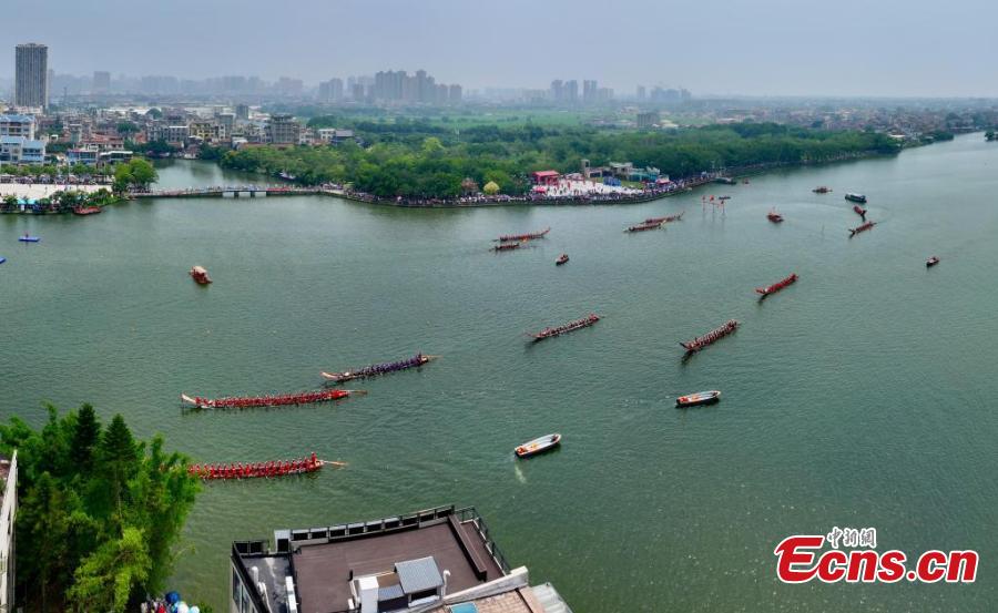 Dragon boats gather for a racing event on Mulan River in Putian, east China's Fujian Province, June 2, 2025. (Photo: China News Service/Wang Dongming)