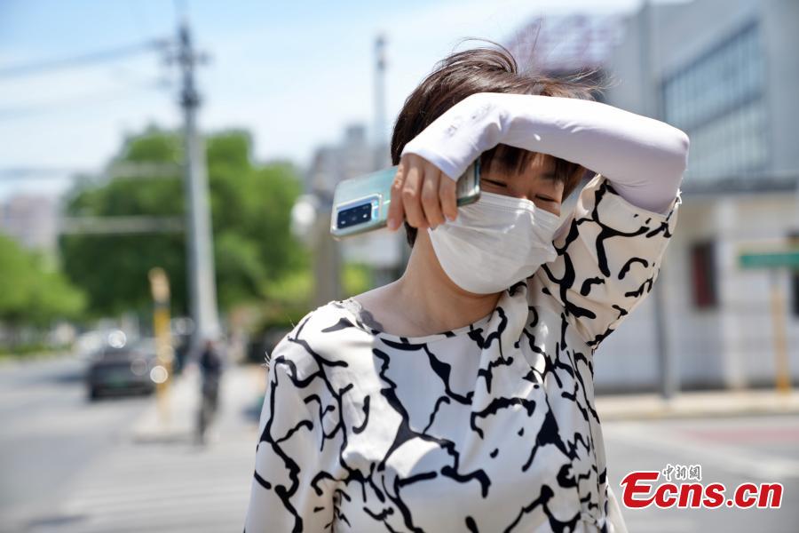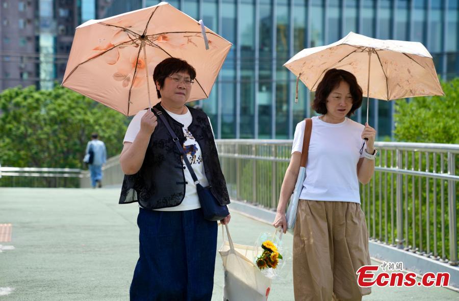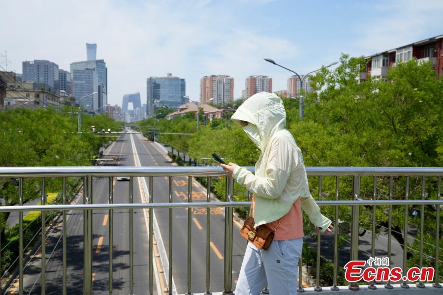 People take sun protection measures during the first high-temperature day of the year in Beijing, June 5, 2025. The Beijing Meteorological Observatory issued an orange heat alert at 6 p.m. on June 4. (Photo: China News Service/Chen Fangting)