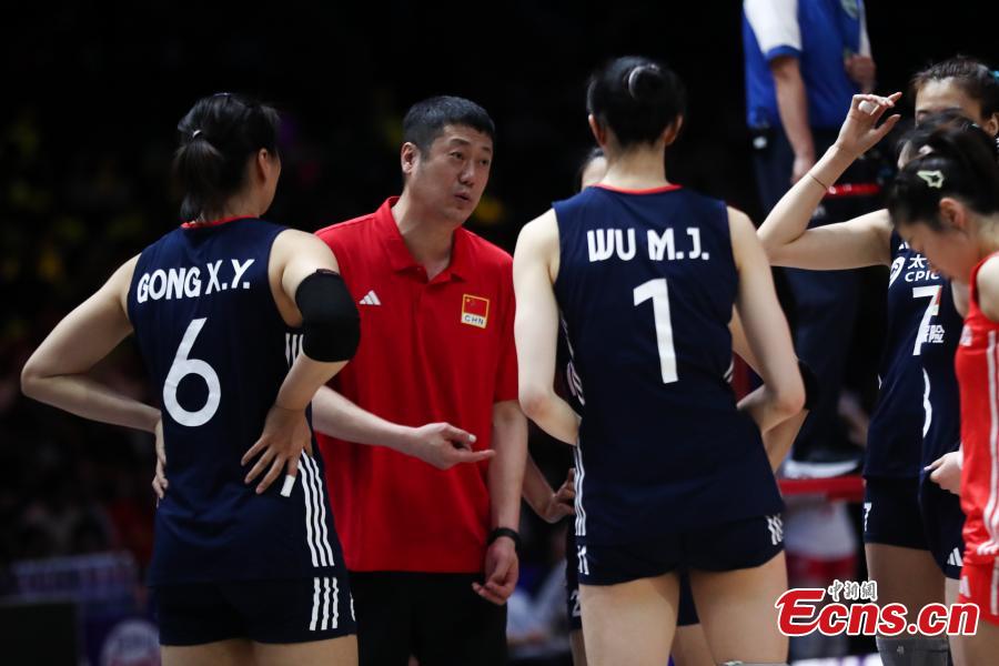 Chinese women's volleyball coach Zhao Yong guides his players during a match against France at the Women's Volleyball Nations League (VNL) 2025 Beijing at the National Indoor Stadium in Beijing, China, June 7, 2025. (Photo: China News Service/Zhang Xiangyi)