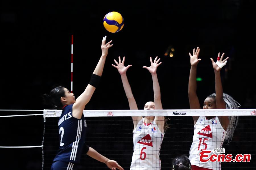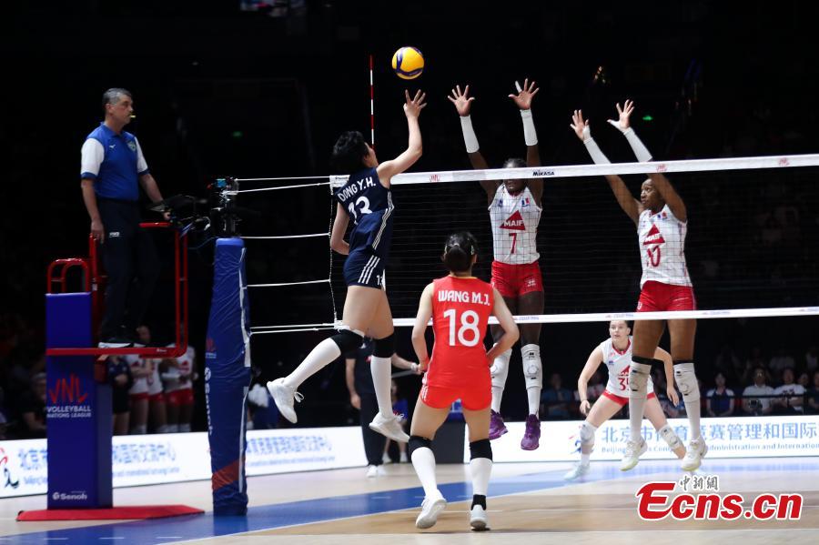 Chinese and French volleyball players compete at the Women's Volleyball Nations League (VNL) 2025 Beijing at the National Indoor Stadium in Beijing, China, June 7, 2025. (Photo: China News Service/Zhang Xiangyi)