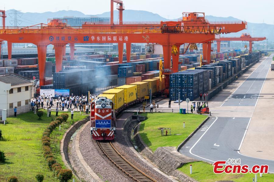 A freight train is ready to leave Jinhua, east China’s Zhejiang Province, for Azerbaijan on June 18, 2025. (Photo provided to China News Service)
