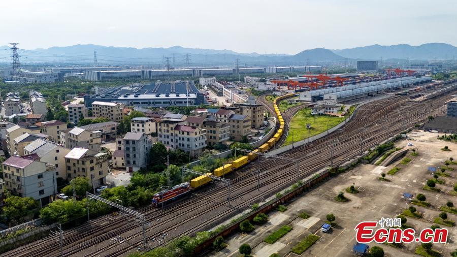 An aerial photo shows a freight train departing from Jinhua, east China’s Zhejiang Province, for Azerbaijan, June 18, 2025. (Photo provided to China News Service)