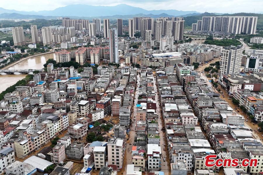 The flood in the disaster-stricken area of Huaiji County, Zhaoqing City, Guangdong Province subsides, with mud accumulated in the streets, June 19, 2025. (Photo: China News Service/Chen Chuhong)