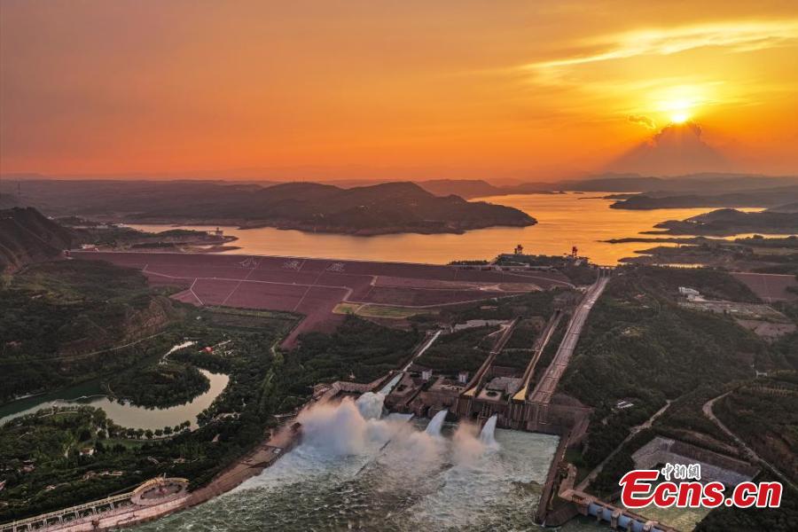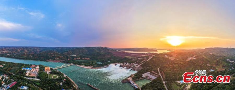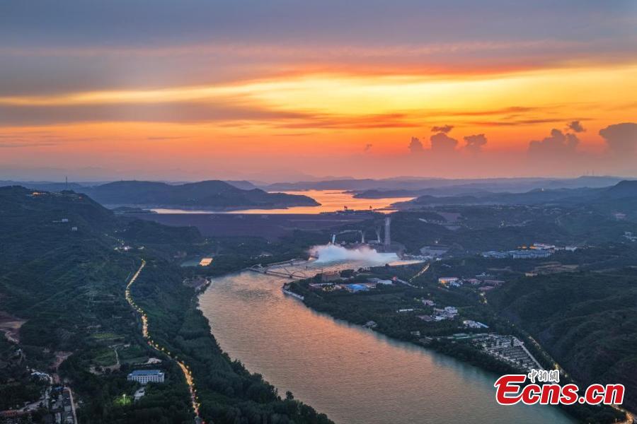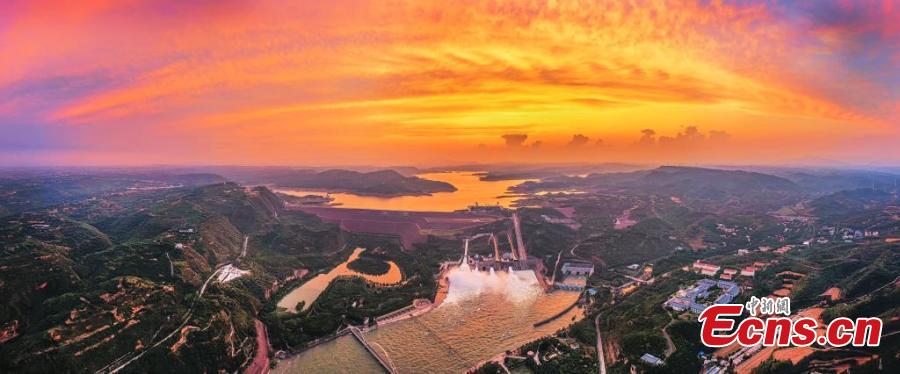 Sunset glow lights up the sky over Xiaolangdi Reservoir, creating a magnificent scene on the Yellow River in central China's Henan Province. (Photo provided to China News Service)
