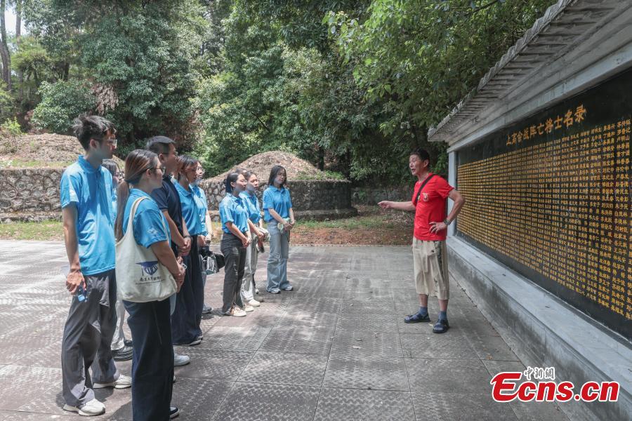 A group pf college students learn about the history of the Battle of Shanggao at the Shanggao Martyrs' Cemetery for Anti-Japanese War heroes in Jiangxi Province, July 16, 2025. (Photo: China News Service/Liu Lixin)