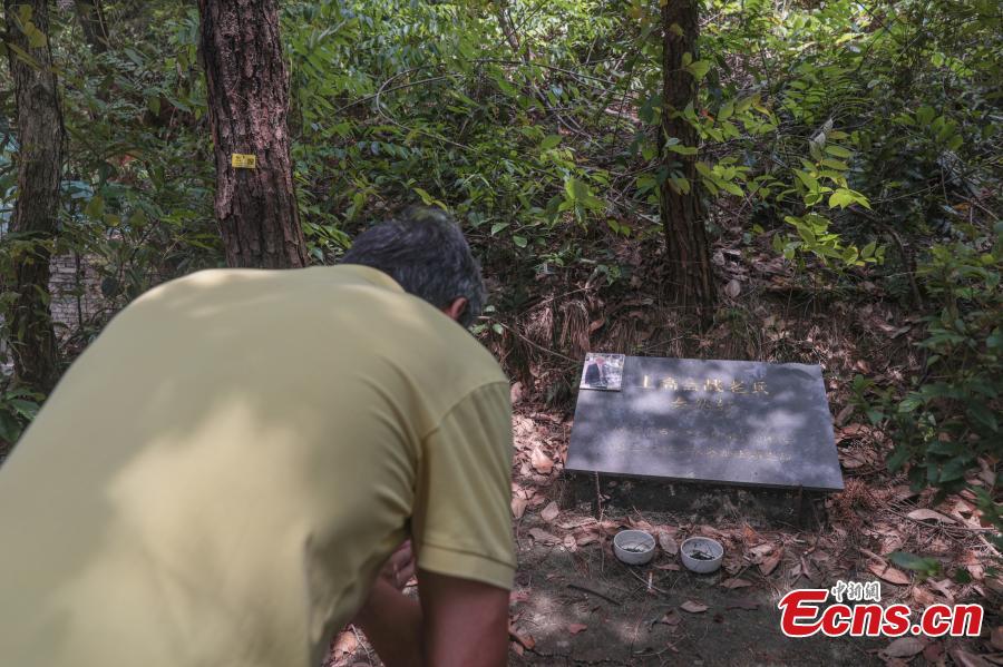 Qin Honghua, a descendant of late veteran Qin Ranxuan in the Battle of Shanggao, bows before his father's tombstone at the Shanggao Martyrs' Cemetery for Anti-Japanese War heroes in Jiangxi Province, July 16, 2025. (Photo: China News Service/Liu Lixin)