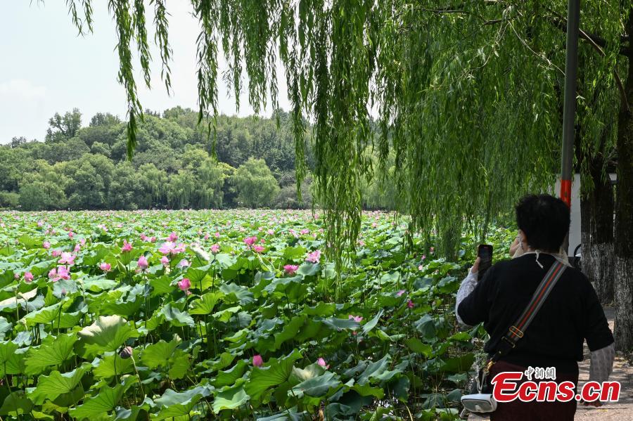 A tourist takes photos of lotus flowers in Hangzhou's West Lake scenic area, July 17, 2025. (Photo: China News Service/Wang Gang)