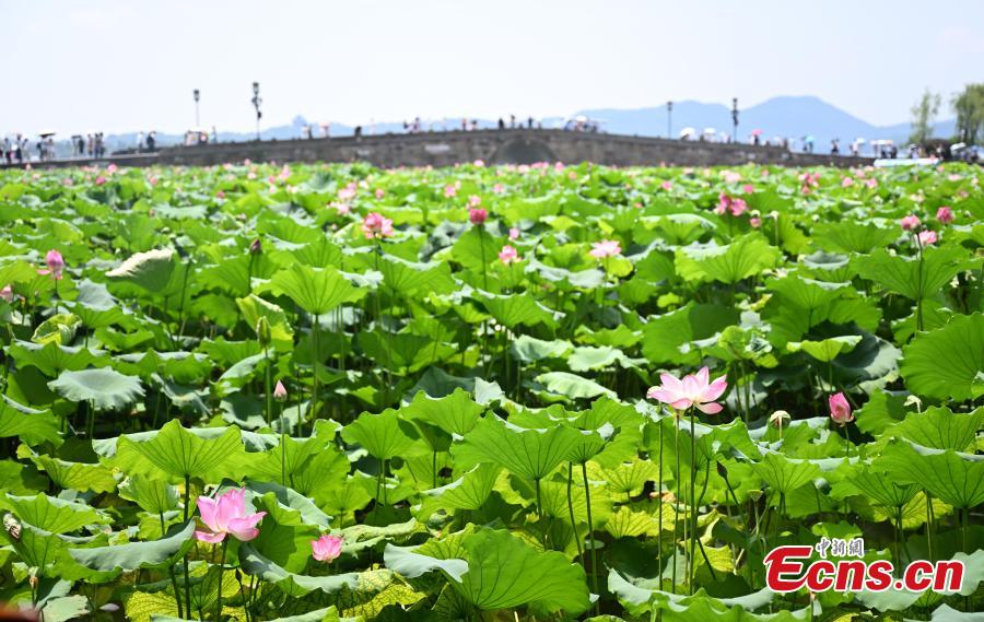 Lotus flowers in Hangzhou's West Lake scenic area have reached peak bloom, attracting numerous visitors.