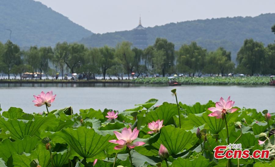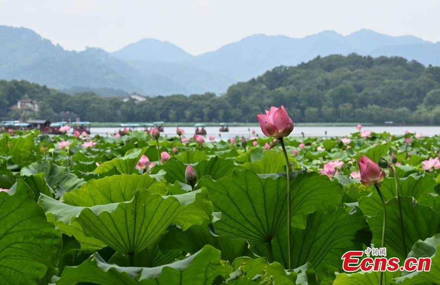Lotus flowers bloom in succession against the backdrop of West Lake's surrounding hills in Hangzhou, Zhejiang Province, July 17, 2025. (Photo: China News Service/Wang Gang)