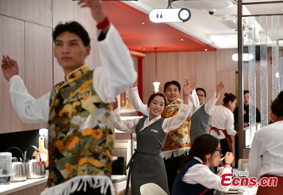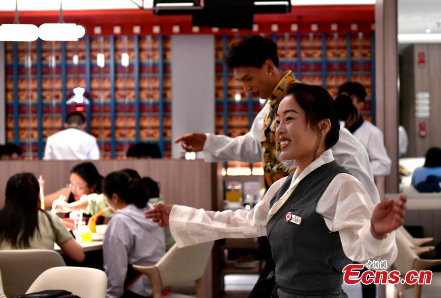 Photo shows the service staff singing and dancing at a restaurant in Lhasa, Xizang Autonomous Region, Aug. 4, 2025. (Photo: China News Service/Li Lin)