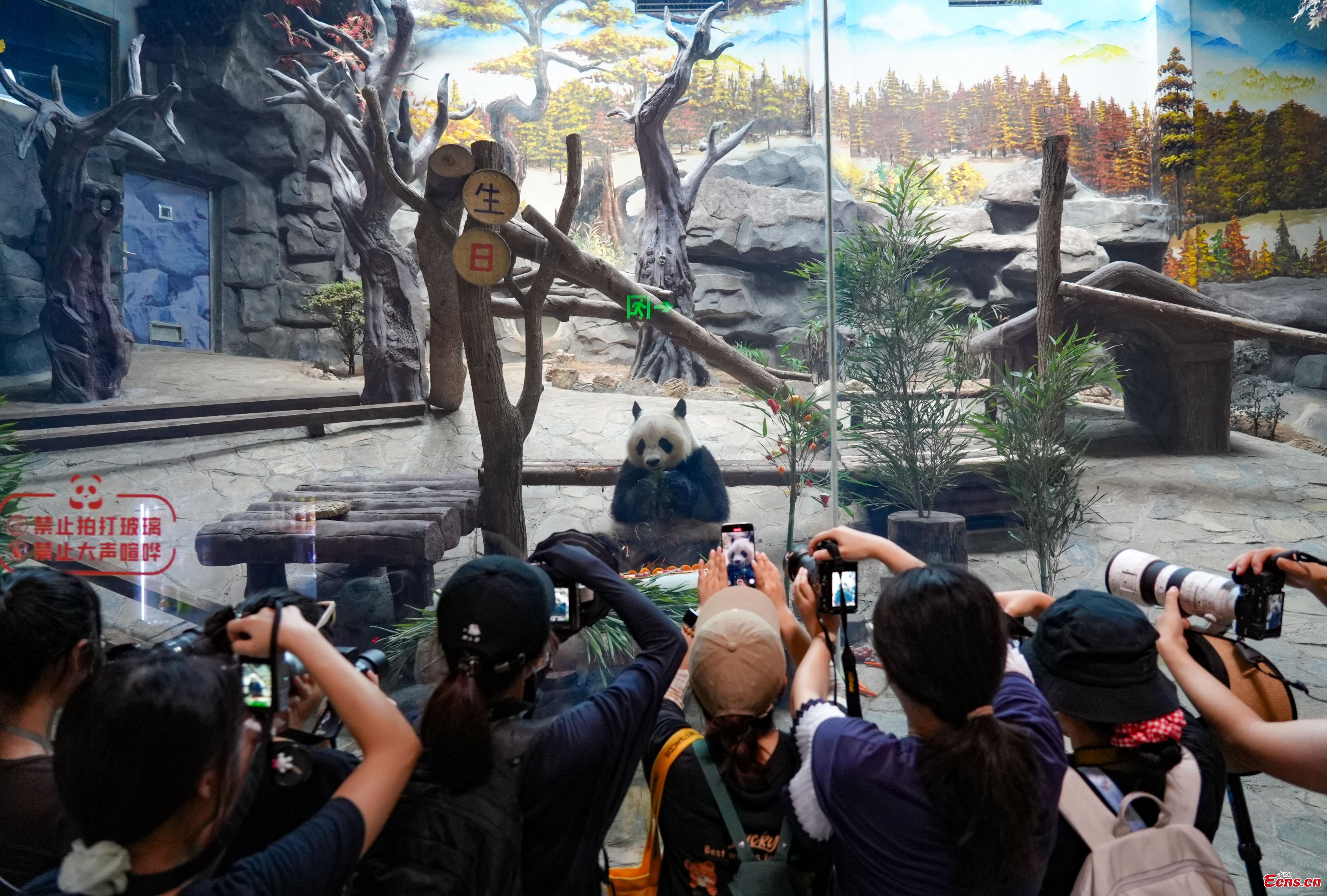 Visitors take photos of giant panda Qing Hua at LocalJoy Theme Park in Yongchuan District, southwest China’s Chongqing, Aug. 6, 2025. (Photo provided to China News Service)