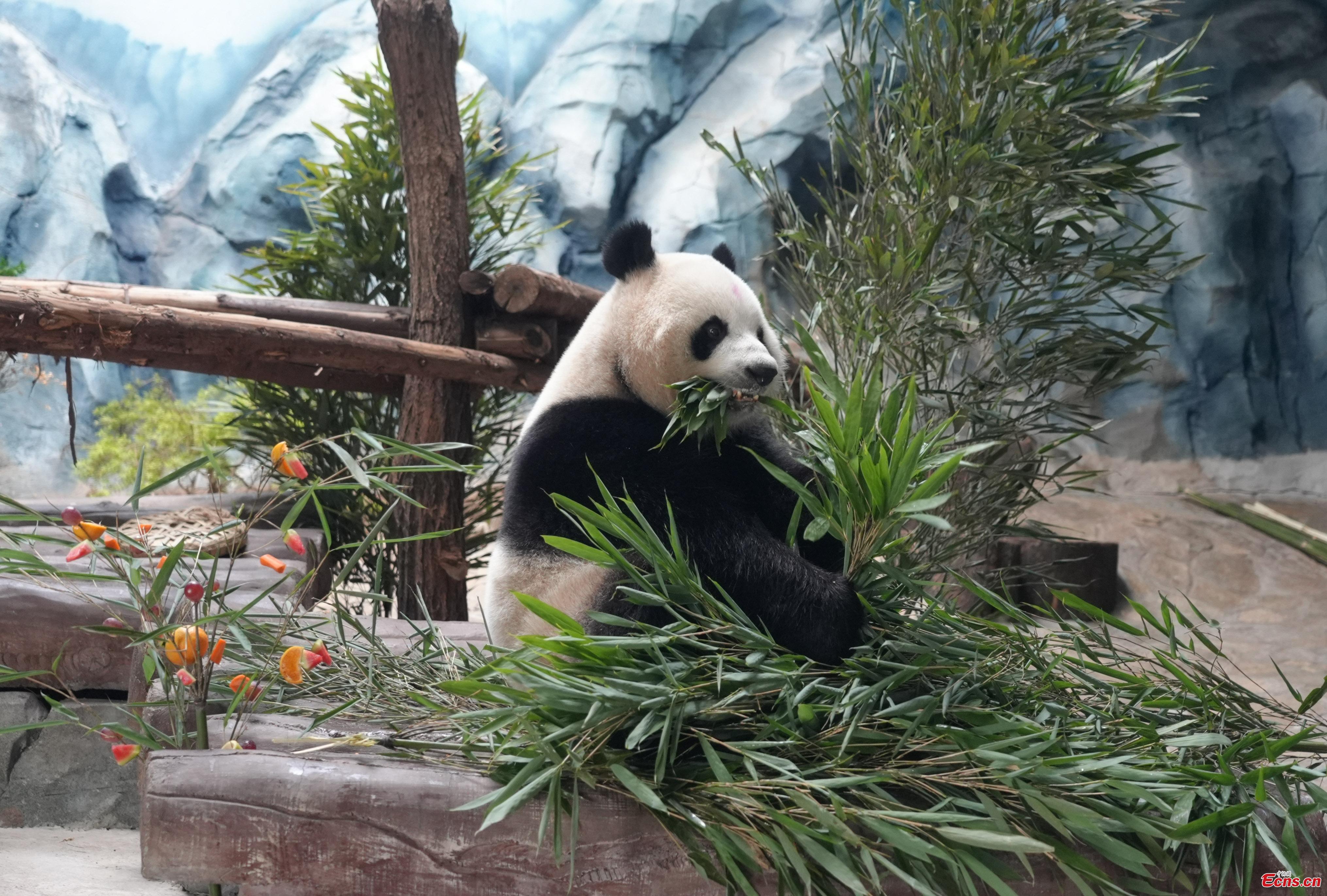 Giant panda Qing Hua enjoys its birthday cake at LocalJoy Theme Park in Yongchuan District, southwest China’s Chongqing, Aug. 6, 2025. (Photo provided to China News Service)