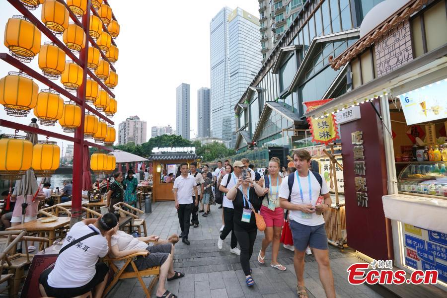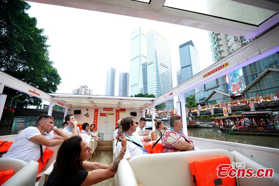 Photo taken on Aug. 6, 2025 shows international athletes, coaches, and referees tour Dongmen Wharf in Chengdu, southwest China’s Sichuan Province ahead of the World Games 2025. (Photo: China News Service/An Yuan)