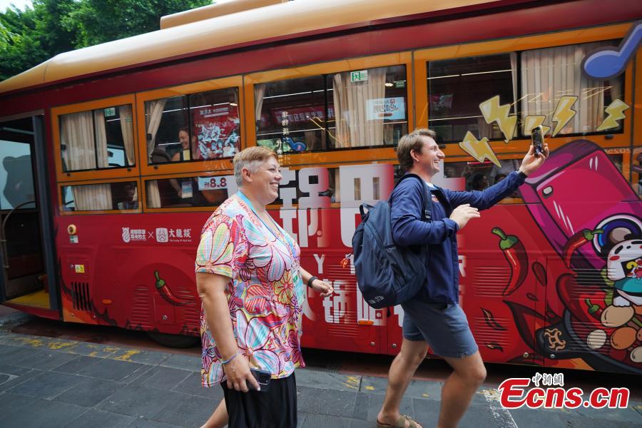 International athletes, coaches, and referees take photos in front of a hotpot-themed bus in Chengdu, southwest China’s Sichuan Province, Aug. 6, 2025. (Photo: China News Service/An Yuan)