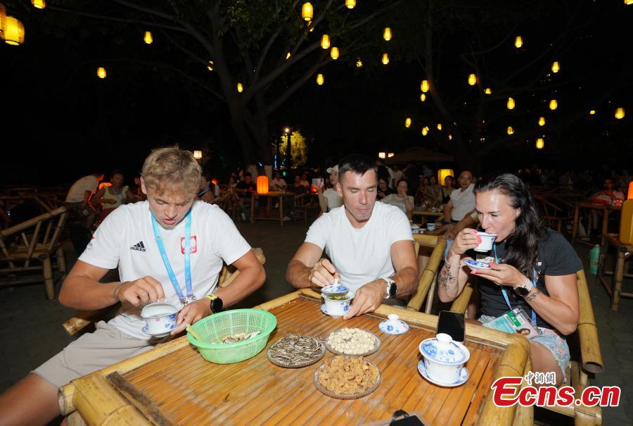 International athletes, coaches, and referees taste covered-bowl tea at Wangjianglou Park in Chengdu, southwest China’s Sichuan Province, Aug. 6, 2025. (Photo: China News Service/An Yuan)