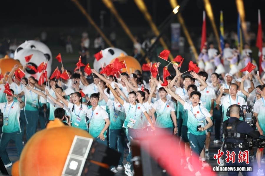 Members of the delegation of China parade during the opening ceremony of the World Games 2025 in Chengdu, southwest China's Sichuan Province, on Aug. 7, 2025. (Photo: China News Service/Zhang Lang)
