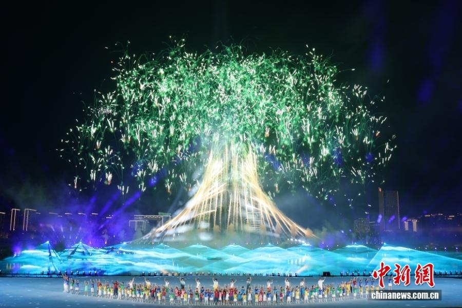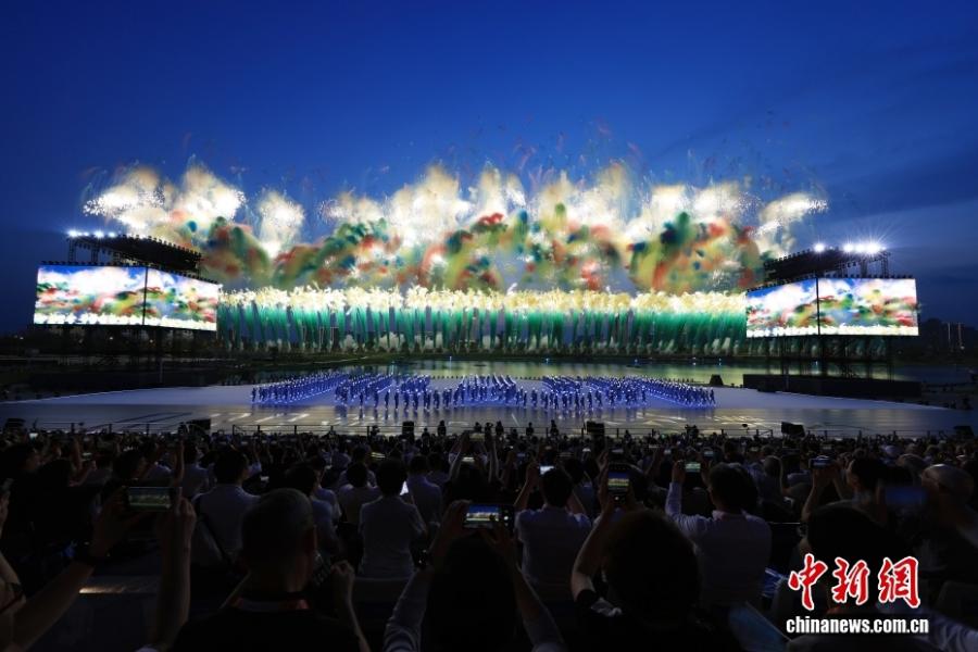Photo taken on Aug. 7, 2025 shows the firework show during the opening ceremony of the World Games 2025 in Chengdu, southwest China's Sichuan Province. (Photo: China News Service/Zhang Lang)