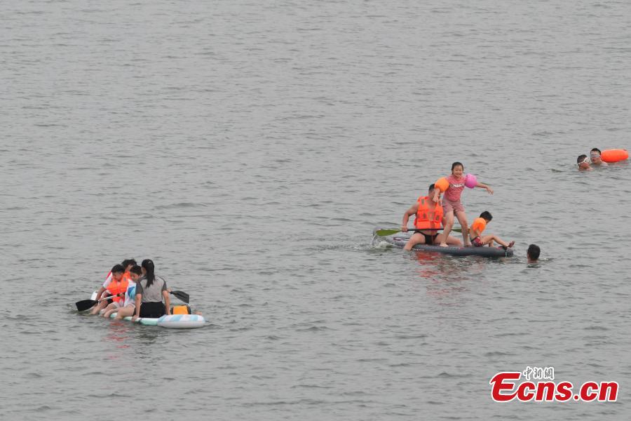 Aerial photo taken on Aug. 11, 2025 shows parents paddling with their children in Changsha, Hunan Province. (Photo: China News Service/Yang Huafeng)