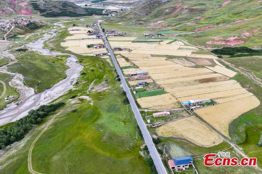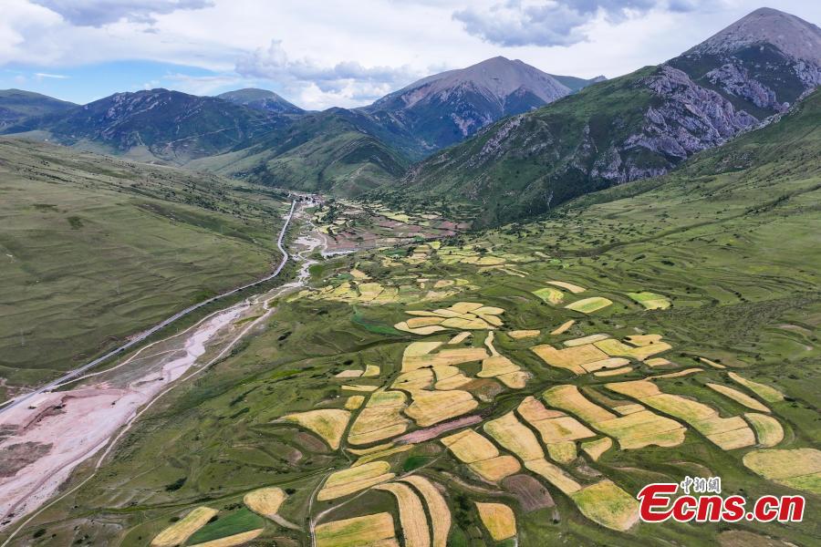 Aerial photo taken on Aug. 17, 2025 shows mature highland barley in Nangqian County, Yushu Tibetan Autonomous Prefecture, northwest China's Qinghai Province. (Photo: China News Service/Xue Di)