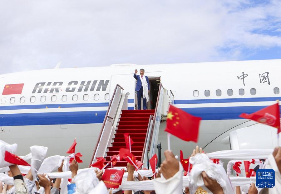 Chinese President Xi Jinping, also general secretary of the Communist Party of China (CPC) Central Committee and chairman of the Central Military Commission, waves to the crowds gathering at the airport to see him off in Lhasa, southwest China's Xizang Autonomous Region, Aug. 21, 2025. Chinese President Xi Jinping on Thursday left Xizang after attending celebrations for the autonomous region's 60th founding anniversary. (Xinhua/Yan Yan)