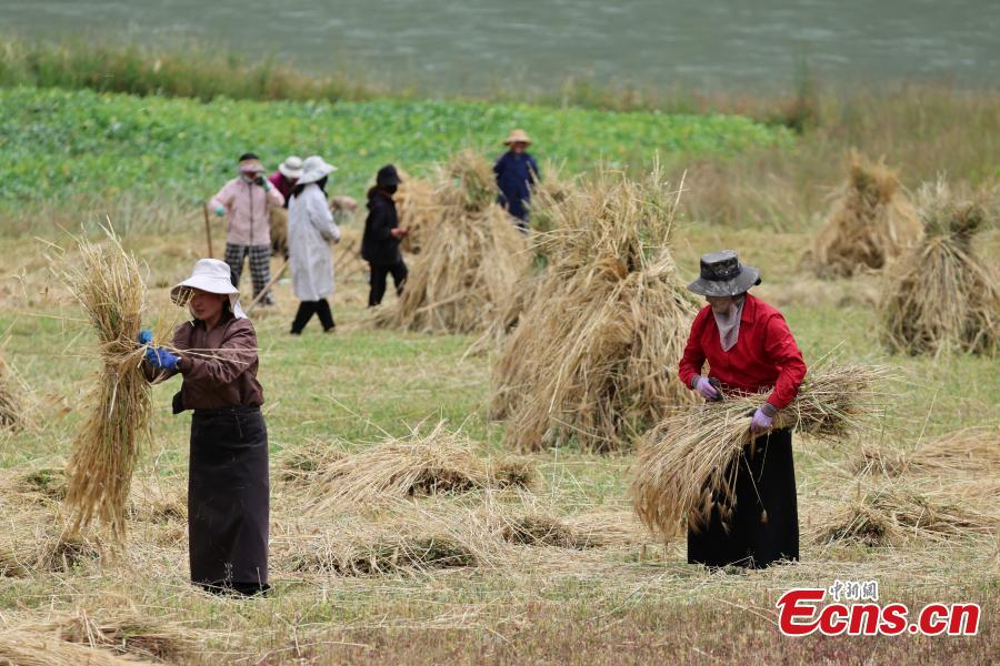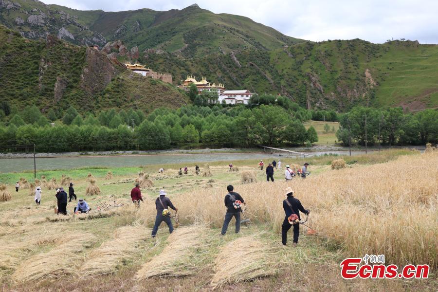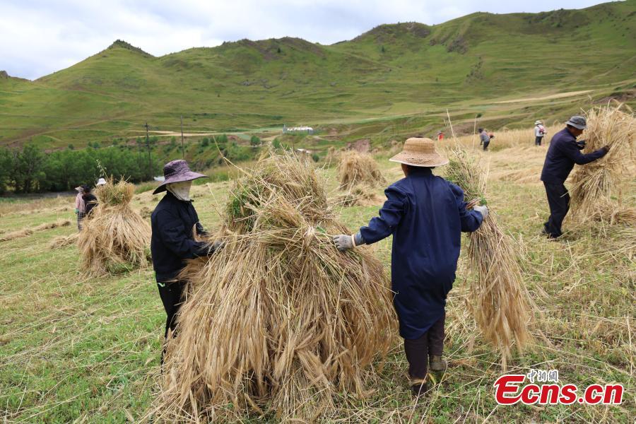 Farmers harvest highland barley in Nangqian County, Yushu Tibetan Autonomous Prefecture, Qinghai Province, Aug. 21, 2025. (Photo: China News Service/ Mao Jianjun)