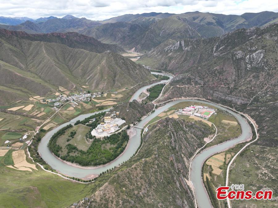 Aerial photo shows ripening highland barley fields along a bend of the Zilaqu River in Nangqian County, Yushu Tibetan Autonomous Prefecture, Qinghai Province, Aug. 21, 2025. (Photo: China News Service/ Mao Jianjun)