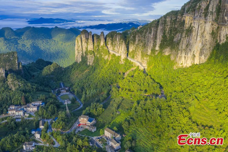 Houses harmoniously contrasted with lush forests at the Enshi Grand Canyon in Enshi Tujia and Miao Autonomous Prefecture, central China's Hubei Province. (Photo provided to China News Service)