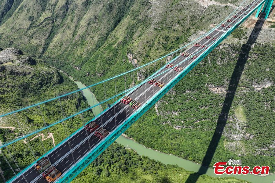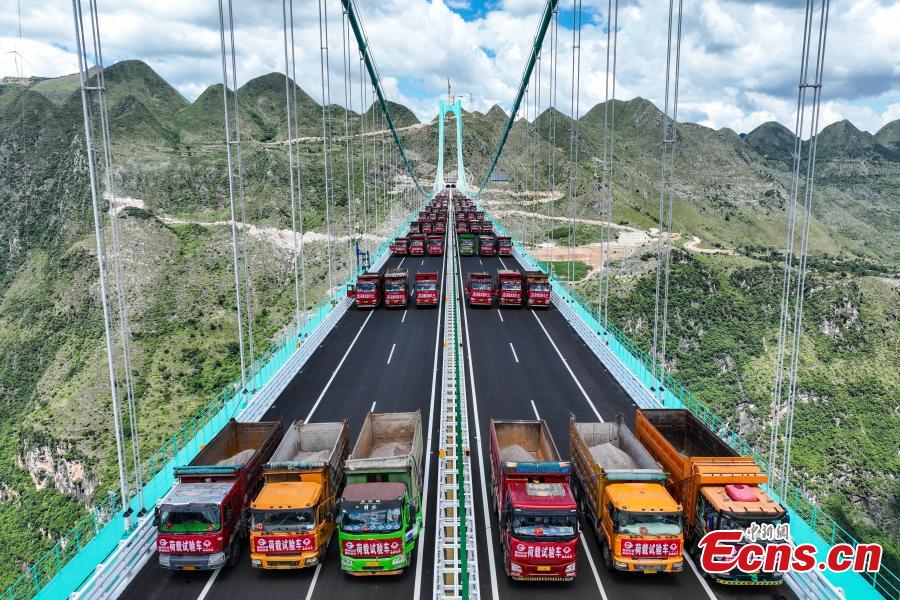 The Huajiang Grand Canyon Bridge in Guizhou Province, the world's highest bridge under construction, conducted a load-bearing test on Monday.