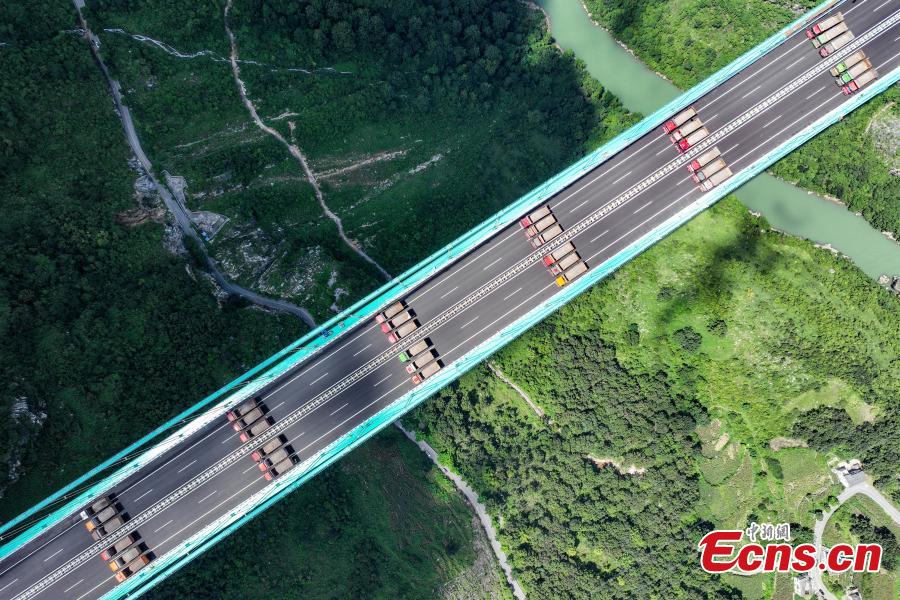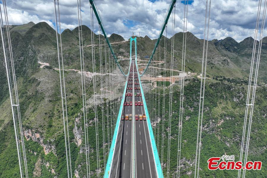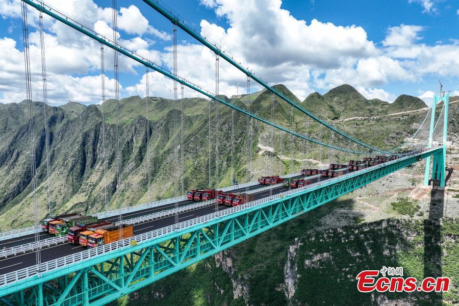 A fleet of 96 trucks weighing a whopping total of 3,360 metric tons drive down the world's highest bridge under construction — the Huajiang Grand Canyon Bridge in Guizhou Province to test its load-bearing capacity, Aug. 25, 2025. (Photo: China News Service/Qu Honglun)