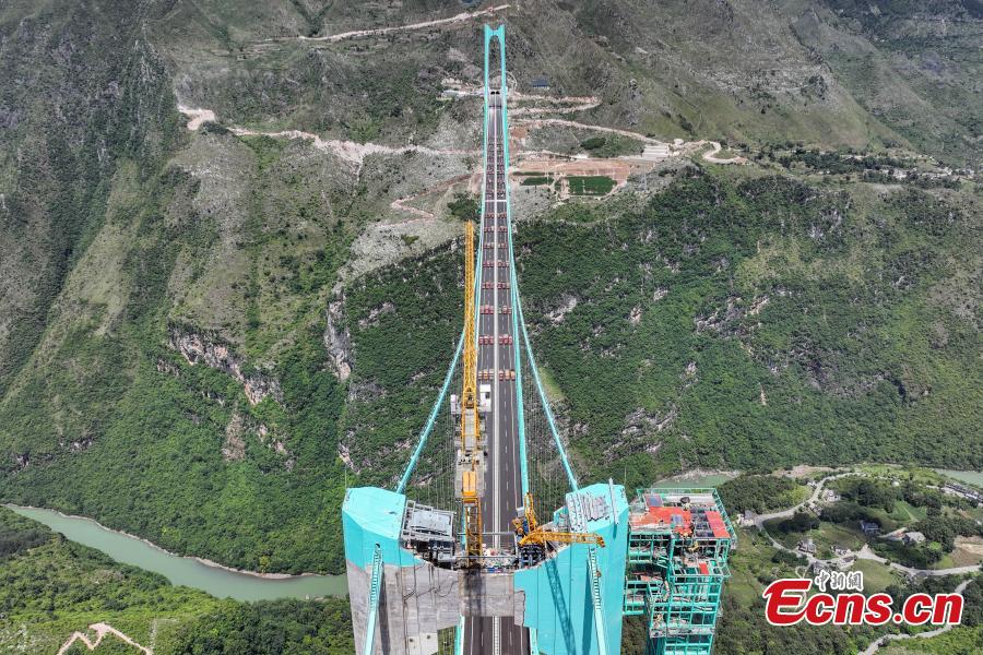 Stretching 2,890 meters in total length with a main span of 1,420 meters, the bridge towers 625 meters above the Beipan River. Once open, it will be the world's highest bridge and longest bridge span in mountainous terrain.