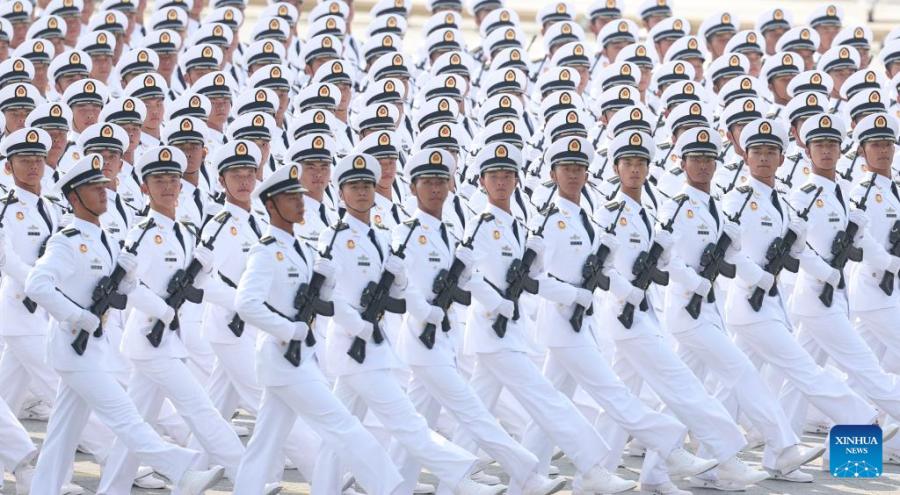 The formation of the Chinese People's Liberation Army Navy marches through Tian'anmen Square during a military parade in Beijing, capital of China, Sept. 3, 2025. China on Wednesday held a grand gathering to commemorate the 80th anniversary of the victory in the Chinese People's War of Resistance against Japanese Aggression and the World Anti-Fascist War. (Photo/Xinhua)