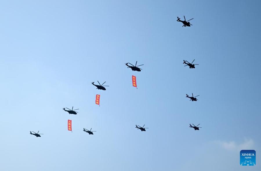 Helicopters form a huge numerical shape of 80 while flying over Tian'anmen Square during a grand gathering to commemorate the 80th anniversary of the victory in the Chinese People's War of Resistance against Japanese Aggression and the World Anti-Fascist War in Beijing, capital of China, Sept. 3, 2025. (Photo/Xinhua)
