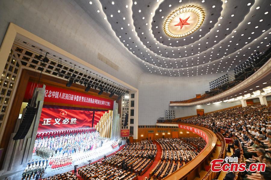 A gala titled Justice Will Prevail is staged at the Great Hall of the People to commemorate the 80th anniversary of the victory in the Chinese People's War of Resistance Against Japanese Aggression and the World Anti-Fascist War, Sept. 3, 2025, Beijing. (Photo: China News Service/Tian Yuhao)
