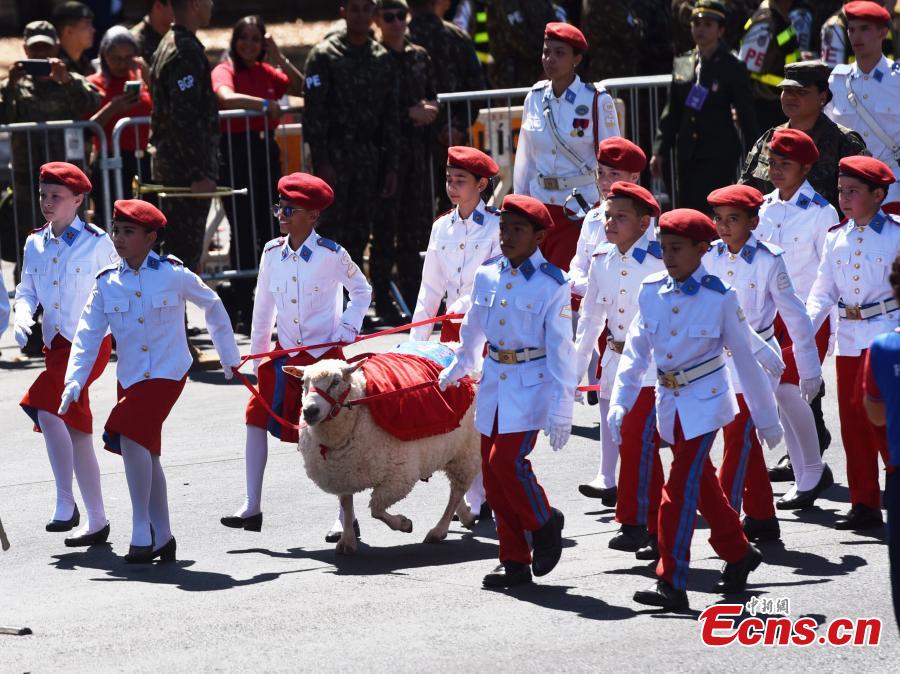 Teenagers take part in a parade with a sheep to celebrate the 203rd anniversary of Independence Day in Brasilia, Brazil, Sept. 7, 2025, local time. (Photo: China News Service/Lin Chunyin)