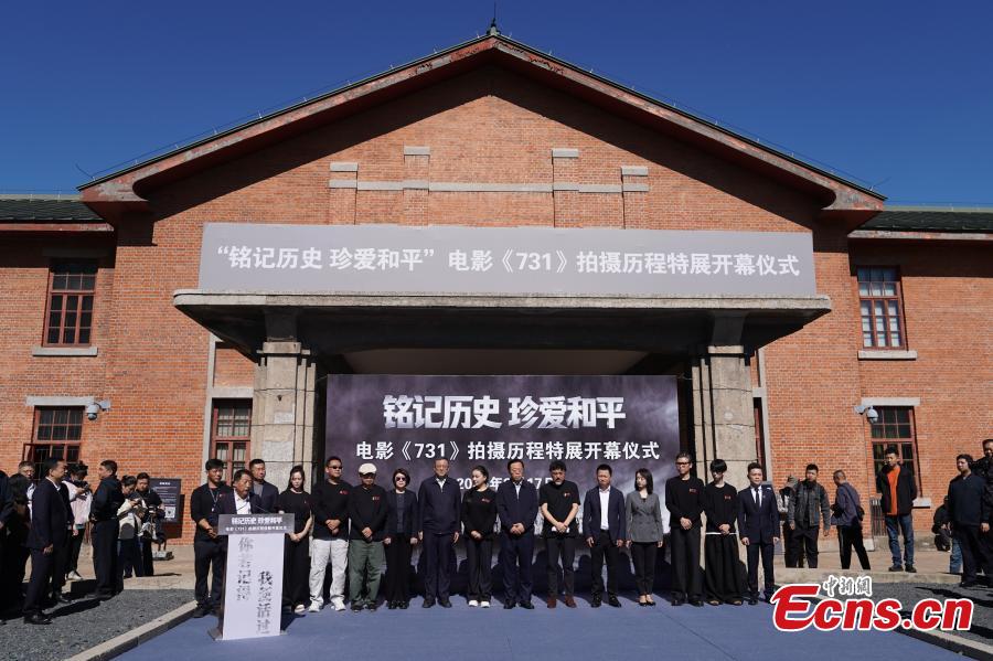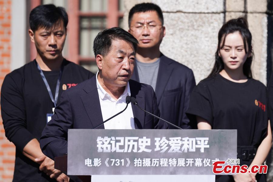 Jin Chengmin, curator of the Museum of Evidence of War Crimes by Japanese Army Unit 731, speaks at the opening ceremony of a special exhibition on the filming journey of the movie Evil Unbound, which reveals atrocities of Japan's Unit 731, in Harbin, northeast Heilongjiang Province, Sept. 17, 2025. (Photo: China News Service/Zhao Yuhang)