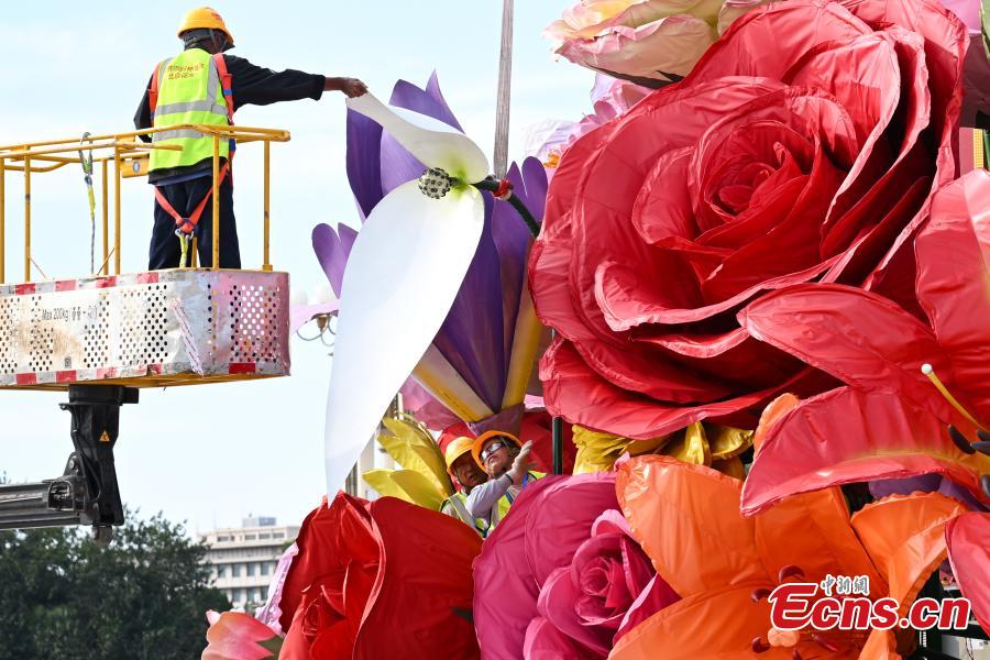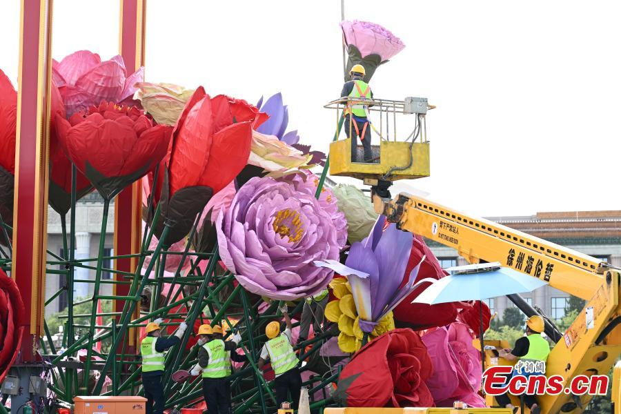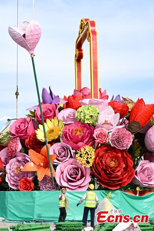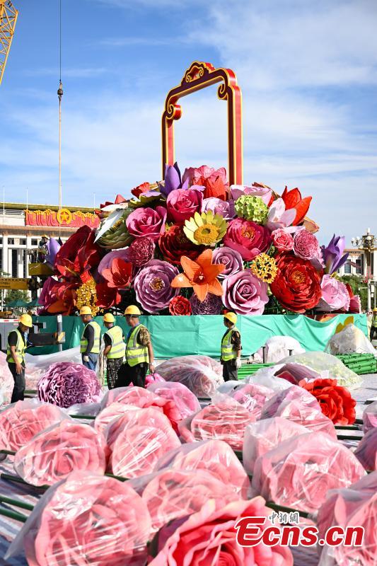 Workers install the giant floral basket named Blessing the Motherland at Tian'anmen Square in Beijing Sept. 18, 2025, as the capital prepares to celebrate the 76th anniversary of the founding of the People's Republic of China on Oct 1.(Photo: China News Service/ Tian Yuhao)