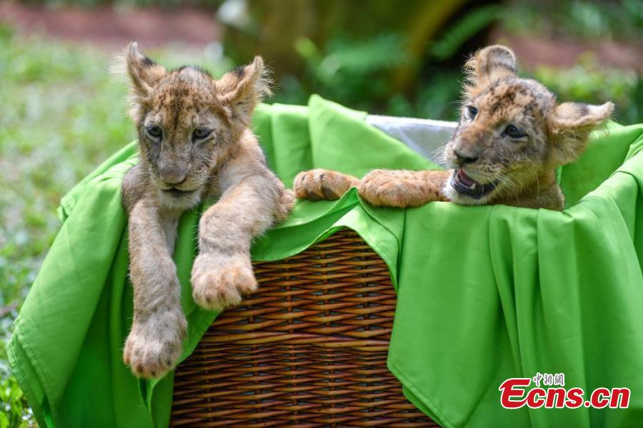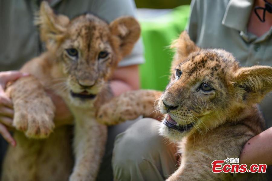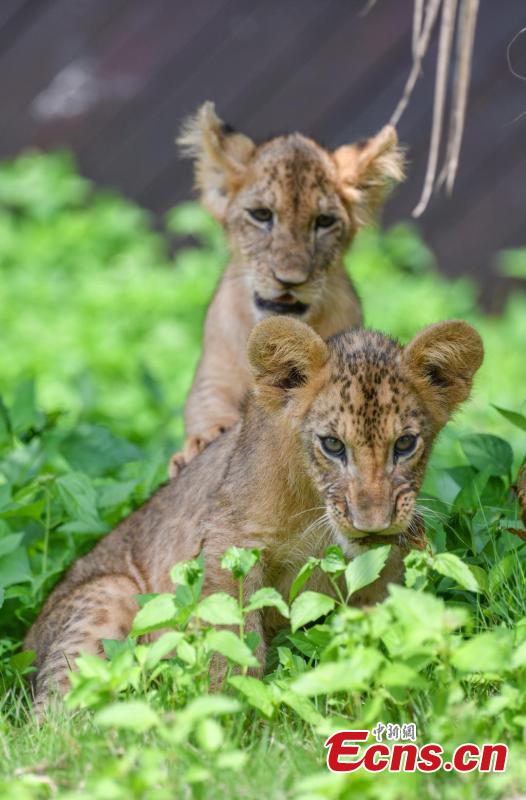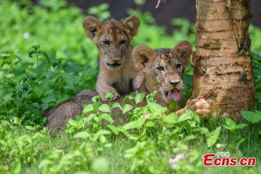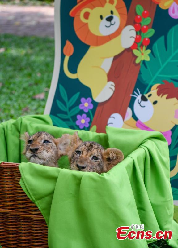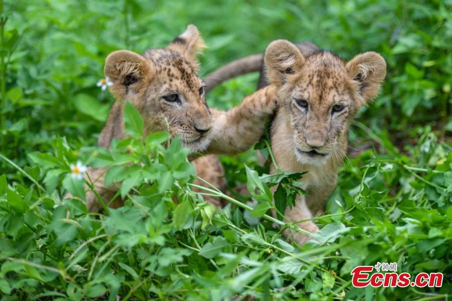 Two-month-old African lion cub siblings make their first public appearance at the Hainan Tropical Wildlife Park and Botanical Garden in Haikou, Hainan Province, Sept. 21, 2025. The playful cubs delighted visitors with their adorable antics. (Photo: China News Service/Luo Yunfei)