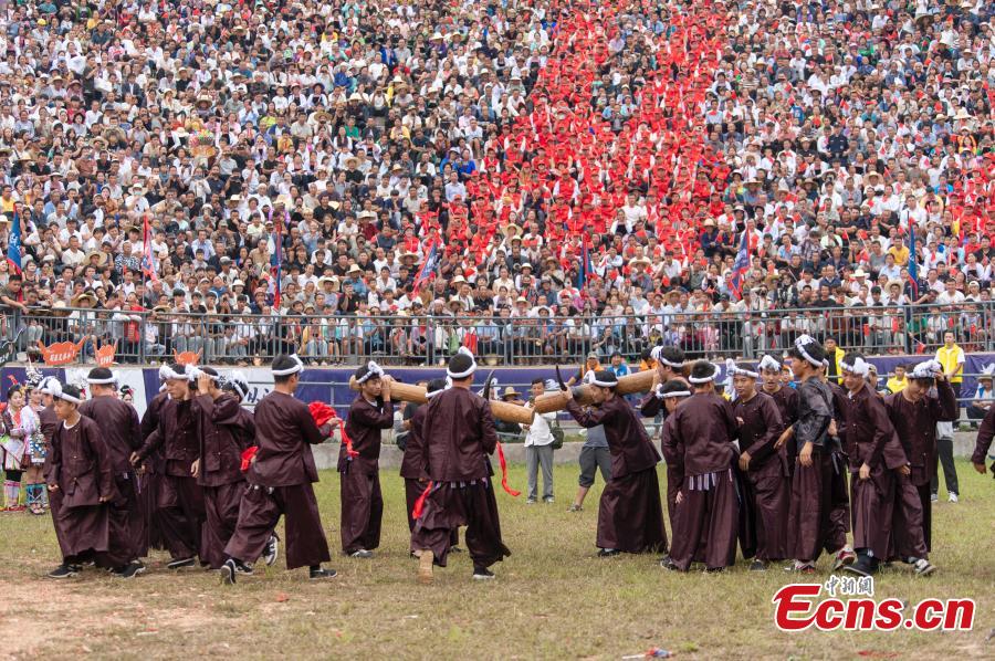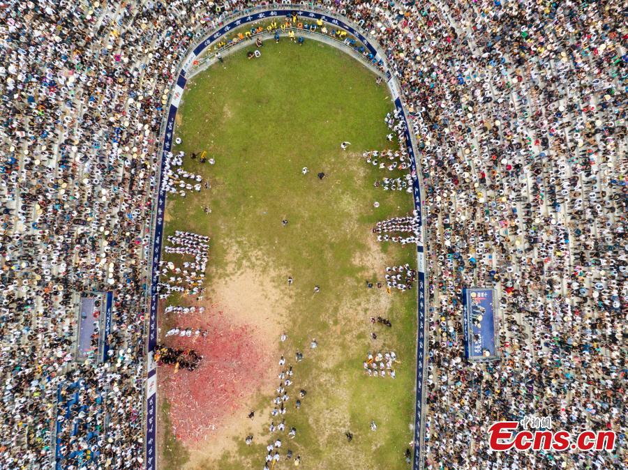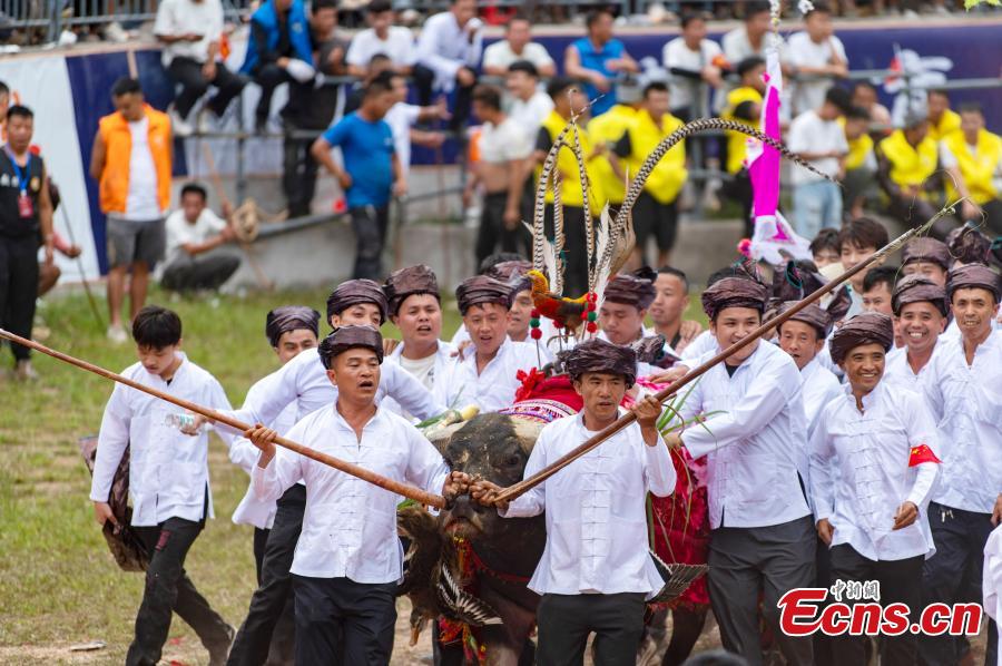 A traditional bullfighting event was held in Bingmei Town in Congjiang County on Saturday. Local residents gathered to celebrate the harvest through folk cultural performances and traditional bullfighting activities. Folk bullfighting is a beloved cultural entertainment among the local Miao and Dong communities.