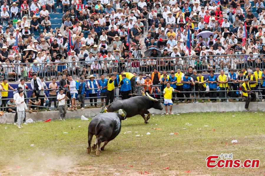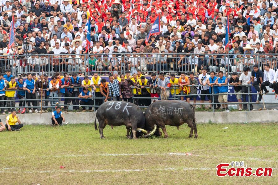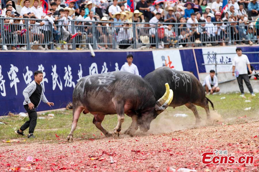 Photo taken on Sept. 20, 2025 shows two bulls engaging in a fight in a folk cultural performance in Congjiang County, Qiandongnan Miao and Dong Autonomous Prefecture, Guizhou Province. (Photo provided to China News Service)